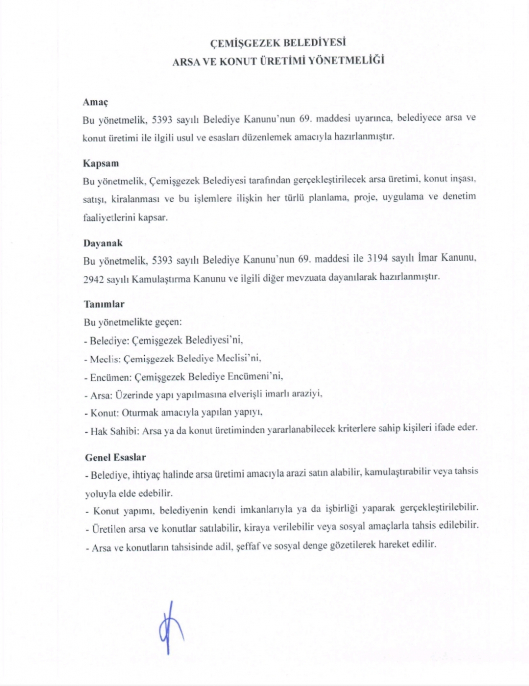 Bu yönetmelik, 5393 sayılı Belediye Kanunu’nun 69. maddesi uyarınca, belediyece arsa ve konut üretimi ile ilgili usul ve esasları düzenlemek amacıyla hazırlanmıştır.