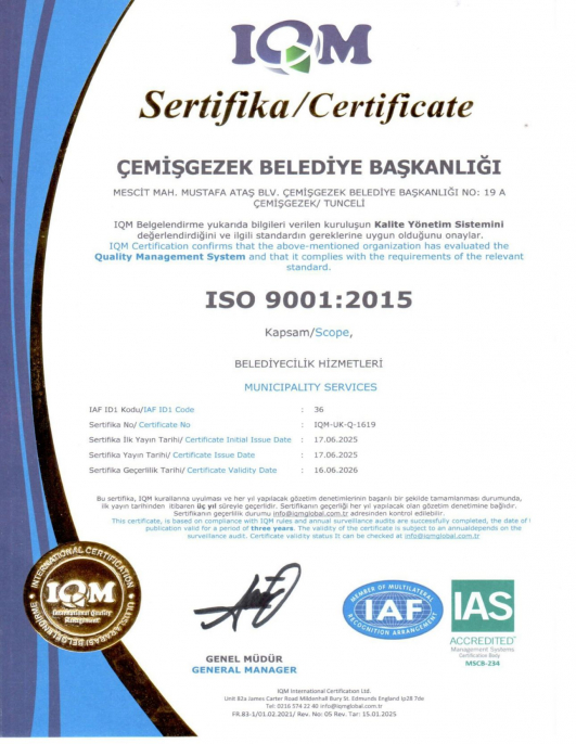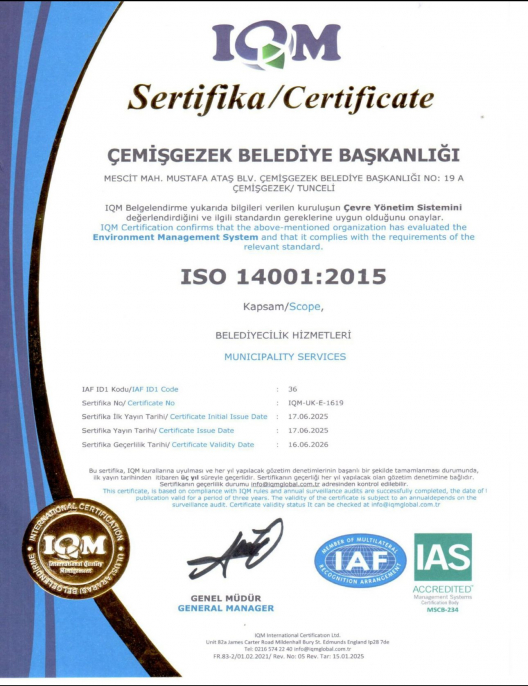 ÇEMİŞGEZEK BELEDİYESİ ISO 9001:2015 ve ISO 14001:2015 BELGESİ ALDI.