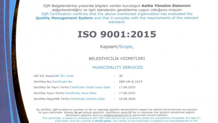 ISO 9001; Belediyemizin kalite yönetim sistemini etkin bir şekilde uyguladığını, vatandaş memnuniyetini ön planda tutarak hizmetlerini sürekli iyileştirdiğini gösteren uluslararası bir standarttır.