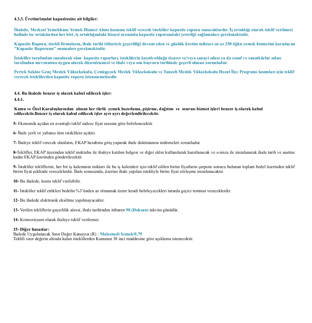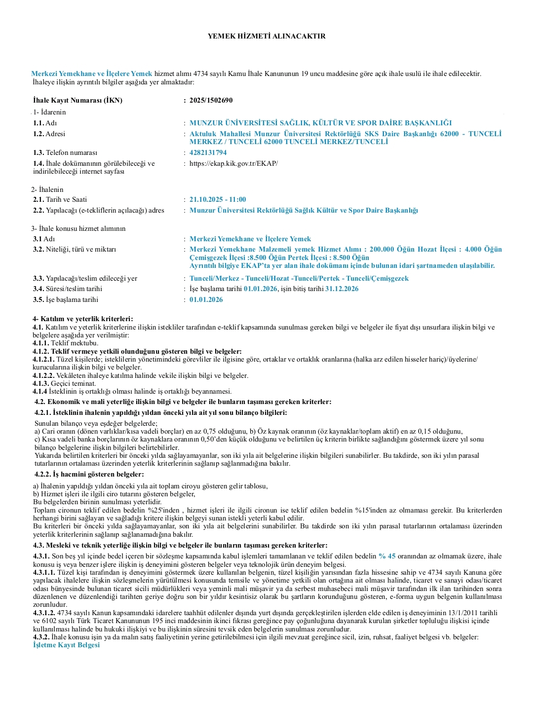 42821317941.3.Telefon numarasi1.4.Ihale dokümaninin görülebileceği ve:https://ekap.kik.gov.tr/EKAP/indirilebilecegi internet sayfasi2-Ihalenin2.1.Tarih ve Saati:21.10.2025-11:00: Munzur Üniversitesi Rektörlüğü Sağlık Kültür ve Spor Daire Baskanhğ2.2.Yapilacaği (e-tekliflerin acilacaği) adres3-Thale konusu hizmet aliminin: Merkezi Yemekhane ve iIcelere Yemek3.1Adi3.2.Niteliği,türü ve mniktari:Merkezi Yemekhane Malzemeli yemek Hizmet Almi : 200.000 Öğün Hozat İlçesi : 4.000 ÖğünCemisgezek Ilcesi:8.500 Öğün Pertek İlcesi :8.500 ÖğünAyrintuli bilgiye EKAP'ta yer alan ihale doküman içinde bulunan idari sartnameden ulasilabilir.:Tunceli/Merkez-Tunceli/Hozat-Tunceli/Pertek-Tunceli/Cemisgezek3.3.Yapilacaği/teslim edilecegi yer3.4.Süresi/teslim tarihi: İse başlama tarihi 01.01.2026,isin bitis tarihi 31.12.2026:01.01.20263.5.Ise baslama tarihi4- Katulim ve yeterlik kriterleri:4.1. Katilim ve yeterlik kriterlerine iliskin istekliler tarafindan e-teklif kapsamında sunulmasi gereken bilgi ve belgeler ile fiyat disi unsurlara iliskin bilgi vebelgelere asağida yer verilmistir:4.1.1.Teklif mektubu.4.1.1.Teklif mektubu.4.1.2.Teklif vermeye yetkili olunduğunu gösteren bilgi ve belgeler:4.1.2.1.Tüzel kişilerde; isteklilerin yönetimindeki görevliler ile ilgisine göre, ortaklar ve ortaklık oranlarina (halka arz edilenhisseler haric)/üyelerine/kurucularina ilişkin bilgi ve belgeler.4.1.2.2.Vekäleten ihaleye katilma halinde vekile iliskin bilgi ve belgeler.4.1.3.Gecici teminat.4.1.4 İsteklinin iş ortakliği olmast halinde is ortakliği beyannamesi.4.2.Ekonomik ve mali yeterliğe ilişkin bilgi ve belgeler ile bunların taşıması gereken kriterler:4.2.1.Isteklinin ihalenin yapıldığı yildan önceki yıla ait yil sonu bilanço bilgileri:Sunulan bilanco veya esdeğer belgelerde;a) Cari oranin (dönen varlıklar/kısa vadeli borçlar) en az 0,75 olduğunu, b) Öz kaynak oranının (öz kaynaklar/toplam aktif) en az 0,15 olduğunu,c) Kısa vadeli banka borçlarının öz kaynaklara oranının 0,50'den küçük olduğunu ve belirtilen üç kriterin birlikte sağlandığını göstermek üzere yil sonubilanco belgelerine iliskin bilgileri belirtebilirler.Yukarida belirtilen kriterleri birönceki yılda sağlayamayanlar, son iki yıla ait belgelerine ilişkin bilgileri sunabilirler. Bu takdirde, son iki yilin parasaltutarlarinin ortalamasi üzerinden yeterlik kriterlerinin sağlanip sağlanmadiğina bakilur.4.2.2.Is hacmini gösteren belgeler:a) İhalenin yapıldığı yıldan önceki yila ait toplam ciroyu gösteren gelir tablosu,b)Hizmet işleri ile ilgili ciro tutarını gösteren belgeler,Bu belgelerden birinin sunulmasi yeterlidir.Toplam cironun teklif edilen bedelin %25'inden , hizmet işleri ile ilgili cironun ise teklif edilen bedelin %15'inden az olmaması gerekir. Bu kriterlerdenherhangi birini sağlayan ve sağladığı kritere ilişkin belgeyi sunan istekli yeterli kabul edilir.Bu kriterleri bir önceki yılda sağlayamayanlar, son iki yıla ait belgelerini sunabilirler. Bu takdirde son iki yılın parasal tutarlarinin ortalamasi üzerindenyeterlik kriterlerinin sağlanip sağlanamadiğina bakilur.4.3.Mesleki ve teknik yeterliğe iliskin bilgi ve belgeler ile bunlarin tasimast gereken kriterler:4.3.1.Son bes yil icinde bedel içeren bir sözleşme kapsamında kabul işlemleri tamamlanan ve teklif edilen bedelin % 45 oranindan az olmamak üzere, ihalekonusu iş veya benzer işlere ilişkin iş deneyimini gösteren belgeler veya teknolojik ürün deneyim belgesi.4.3.1.1. Tüzel kisi tarafindan is deneyimini göstermek üzere kullanılan belgenin, tüzel kişiliğin yarısından fazla hissesine sahip ve 4734 sayili Kanuna göreyapilacak ihalelere ilişkin sözleşmelerin yürütülmesi konusunda temsile ve yönetime yetkili olan ortağına ait olması halinde, ticaret ve sanayi odasi/ticaretodasi bünyesinde bulunan ticaret sicili müdürlükleri veya yeminli mali müşavir ya da serbest muhasebeci mali müşavir tarafindan ilk ilantarihinden sonradüzenlenen ve düzenlendiği tarihten geriye doğru son bir yıldır kesintisiz olarak bu şartların korunduğunu gösteren, e-forma uygun belgenin kullanılmasizorunludur.4.3.1.2.4734 sayili Kanun kapsamındaki idarelere taahhüt edilenler dışında yurt dışında gerçeklestirilen işlerden elde edilen is deneyiminin 13/1/2011 tarihlive 6102 sayili Türk Ticaret Kanununun 195 inci maddesinin ikinci fikrasi gereğince pay coğunluğuna dayanarak kurulan sirketler topluluğu ilişkisi icindekullanilmast halinde bu hukuki ilişkiyi ve bu ilişkinin süresini tevsik eden belgelerin sunulmasi zorunludur.4.3.2.Ihale konusu isin ya da malin satis faaliyetinin yerine getirilebilmesi icin ilgili mevzuat gereğince sicil,izin, rhsat,faaliyet belgesi vb. belgeler:Isletme Kayit Belgesi